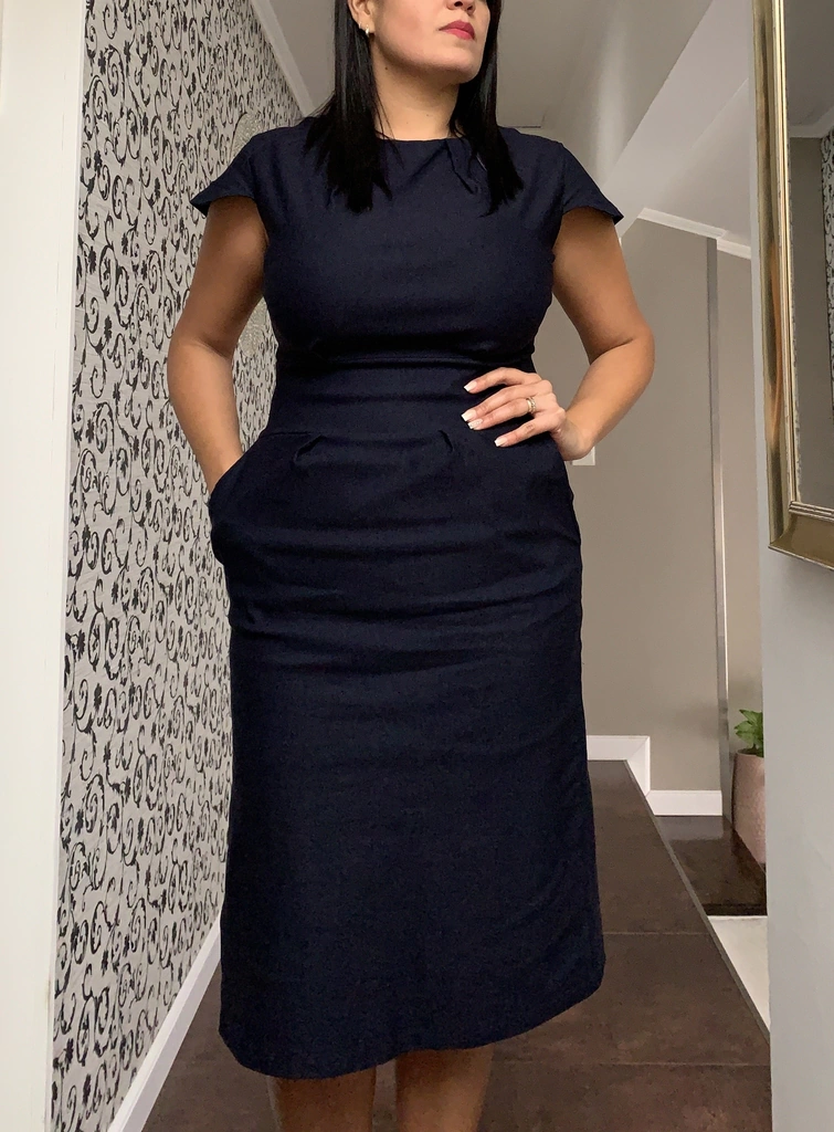 Vestido recto con pinzas en escote, falda recta con pinzas delanteras y cierre invisible al tono.